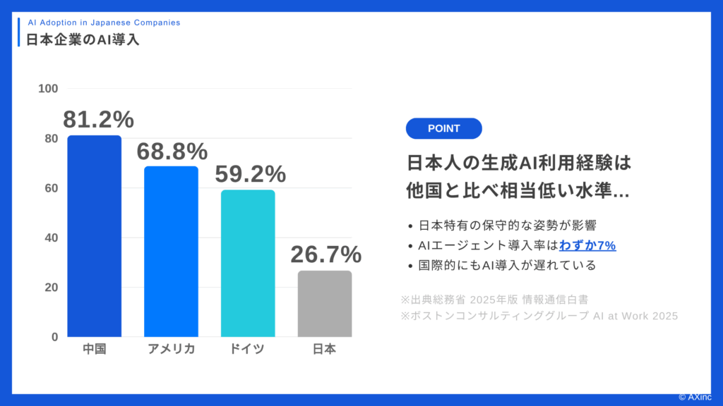 世界的に生成AIの活用が急速に進む中、日本の現状と課題を正確に把握することは、次の戦略を立てる上で不可欠です。