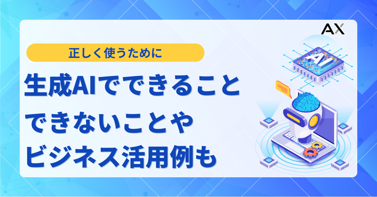 この記事では、2026年時点の最新情報に基づき、生成AIでできること10選を具体的な活用事例と共に解説します。また、生成AIが苦手なことや導入のメリット、注意すべきリスクまで網羅的に紹介することで、あなたが自社に最適なAI活用の道筋を描けるようになることを目指します。AI導入を成功させるための実践的なスキル習得にご興味のある方は、弊社のAI研修サービス「AX CAMP」の資料もぜひご覧ください。