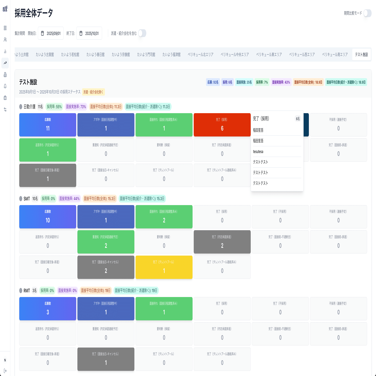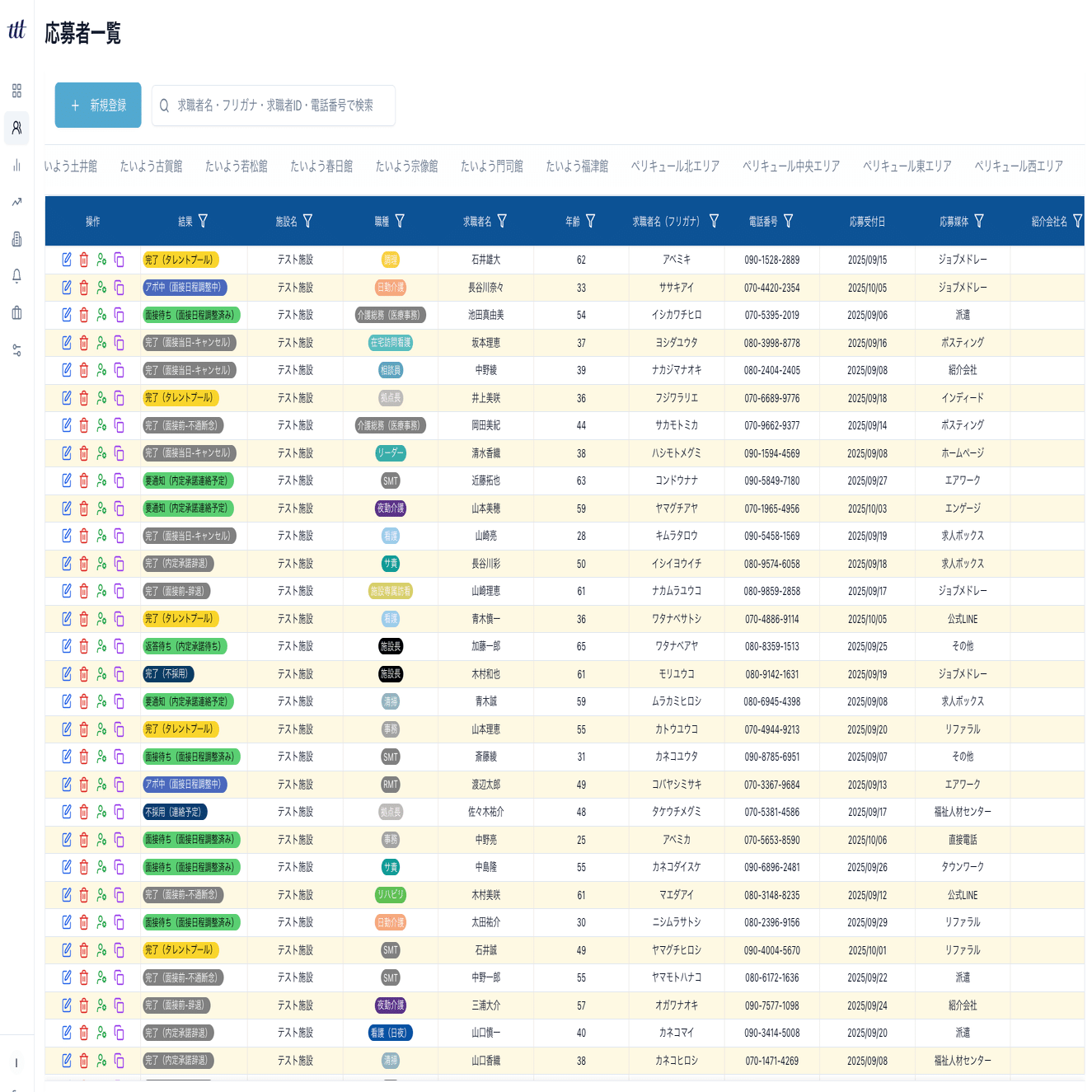 応募者の管理画面(テストデータ)