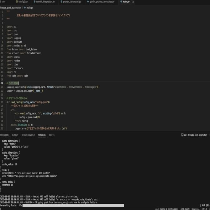 それは間違いなくテキスト系SNS運用の自動化ですね。Pythonでシステムを組んで、バズっている投稿の収集から投稿内容のリライト、そしてAPIを使った自動投稿までを一気通貫で行えるようにしたんです。