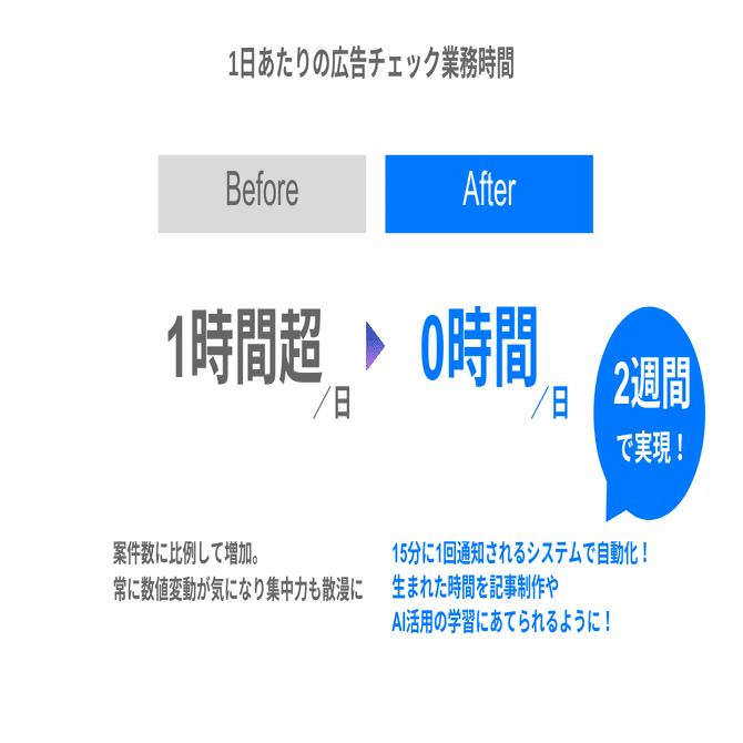 AI開発未経験から、わずか2週間でGoogle広告の数値を「15分に1回」自動で通知する仕組みを自社開発することで、日々のチェック業務をゼロにしました。そして、創出した時間をさらなるAI学習に充てるという「成長の好循環」を生み出しました。