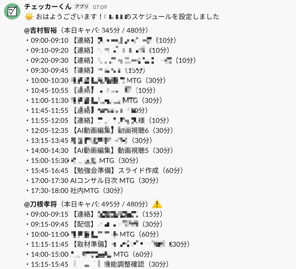 PMツバサさん以外にも、朝礼チャンネルで毎朝スケジュールを伝えてくれる「チェッカーくん」、slack内で未返信のメッセージを教えてくれる「ヌケモレ検知くん」、メッセージのやり取りからタスクを作ってくれる「タスク化くん」などのAIエージェントがいます。