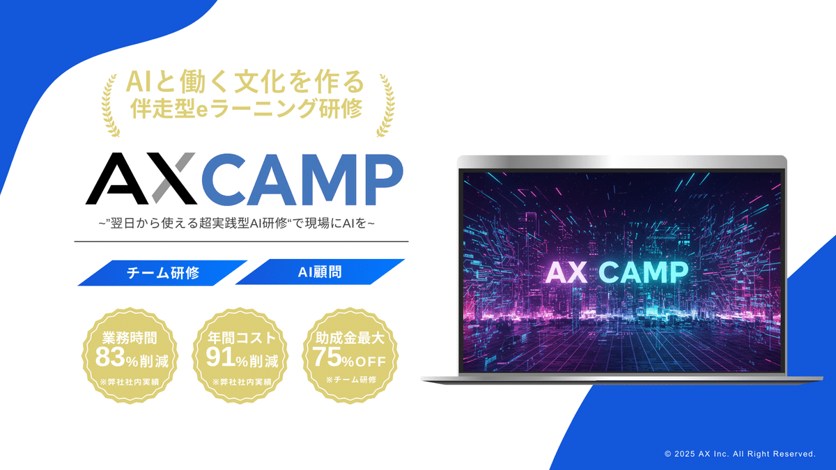 業務AI化のプロ集団AXの「AI顧問サービス AX CAMP」は、eラーニング+AI化伴走支援で御社のAI化を3ヶ月間ガッツリサポートするサービスです。