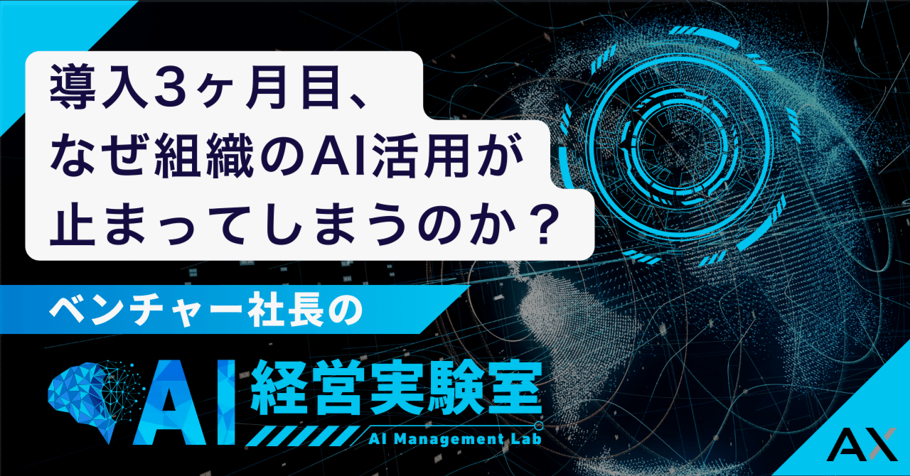 AI導入3ヶ月目に起きる「使う人の固定化」「足並みのズレ」という2つの壁を整理し、運用ルールと成果の可視化が定着の鍵であることを解説。小さな成功業務の選定→運用ルール決定→時間で成果測定→横展開のステップを提示しています。