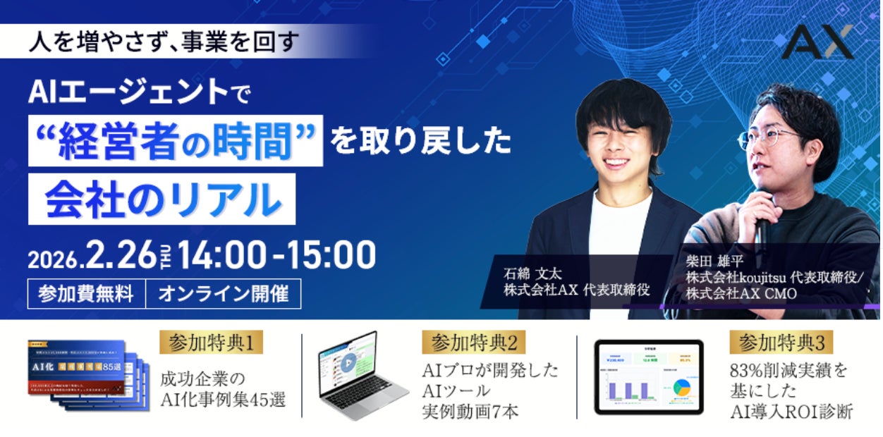 株式会社AXは、累計1,200社以上を支援する事業戦略のプロフェッショナル・株式会社koujitsuとの共催で、2026年2月26日(木)にオンラインセミナー「人を増やさず、事業を回す ー AIエージェントで\”経営者の時間\”を取り戻した会社のリアル」を開催することをお知らせします。AIエージェントを経営者の分身として活用し、人を増やさずに事業を拡大する具体的な方法論と実践ノウハウを、事例を交えて解説します。