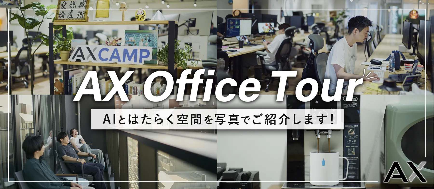AIを“共に働く仲間”と捉える株式会社AXの福岡オフィスを、写真とともに紹介するWantedlyストーリーです。創造性を高めるアート空間、開放的な執務エリア、会議室や集中ブース、バルコニーの“余白時間”まで、AXらしいワークスタイルを解説。