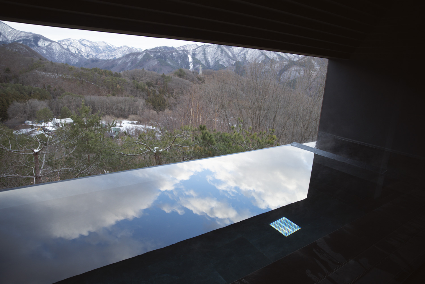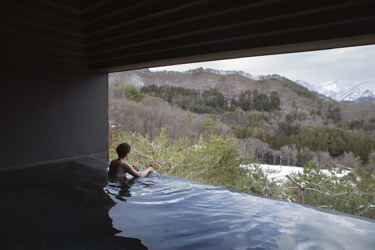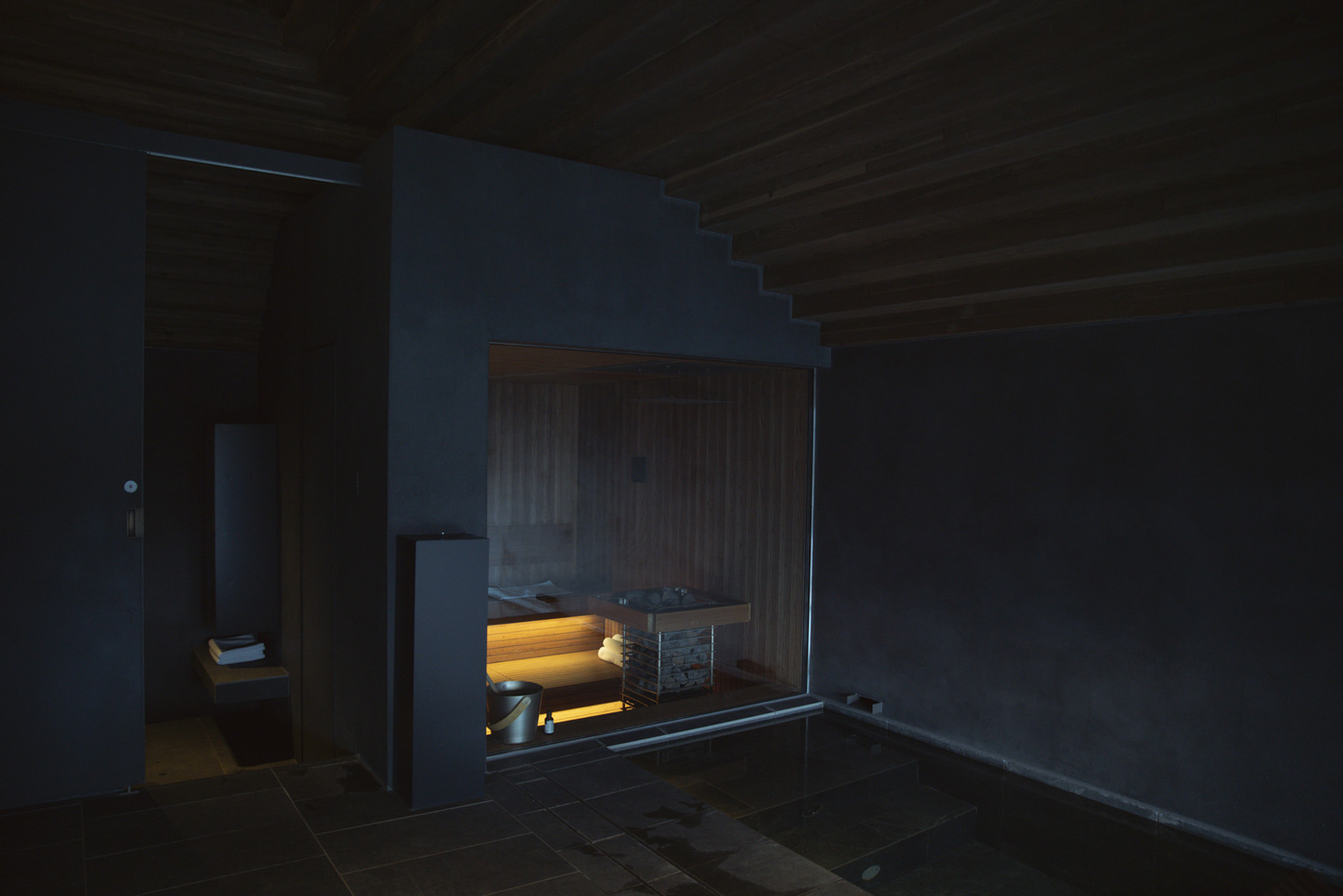 各棟のメインルームを囲むようにインフィニティプール(温水!)があり、その隣にはサウナと温泉。水面に反射した光が天井に揺らめくのを眺めているだけでも、深く癒やされる空間でした。