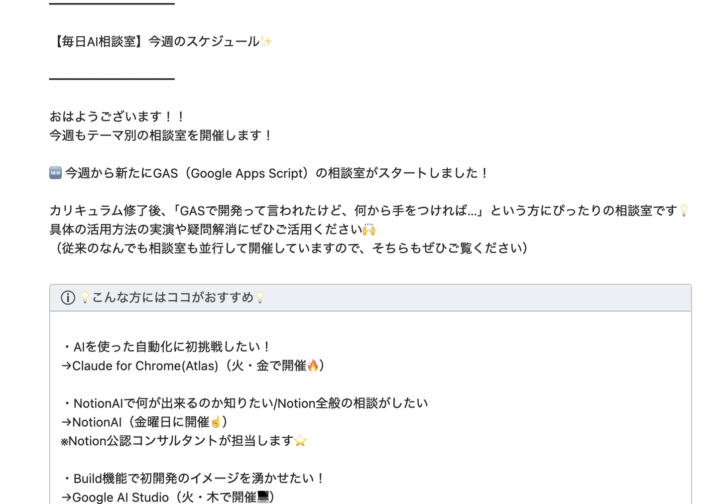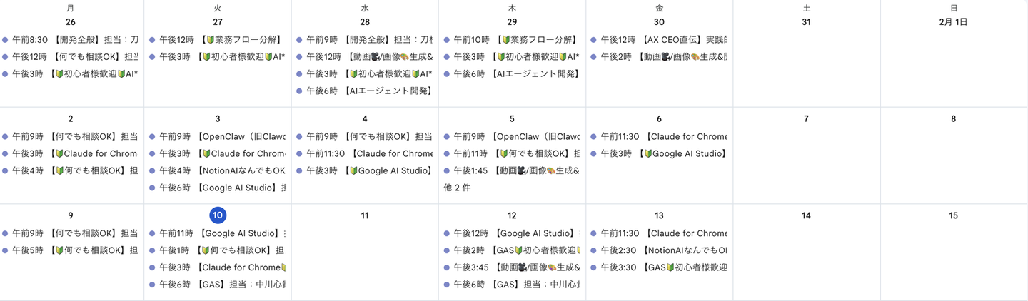 より参加しやすく、具体的な質問を持ち込みやすくするために、業務単位・技術単位にテーマを絞った相談室に進化。例えば、OpenClaw開発相談室、GAS活用相談室、Google AI Studio実践相談室、NotionAI開発相談室など、具体的なテーマを設定しています。「今日はこのテーマで聞きたい」と明確に参加できる仕組みにすることで、クライアントが自分の課題に合った相談室を選びやすくなりました。