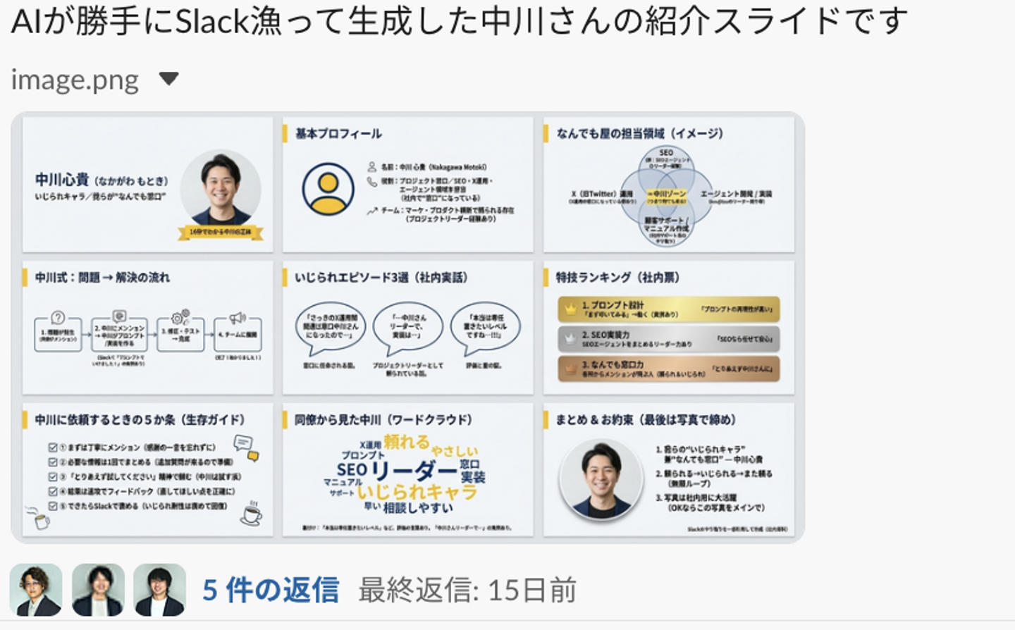 その「距離の近さ」を証明しているのが、このスライド。なんとこれ、AIが社内のSlackデータを勝手に分析して生成した「他己紹介」なんです(笑)