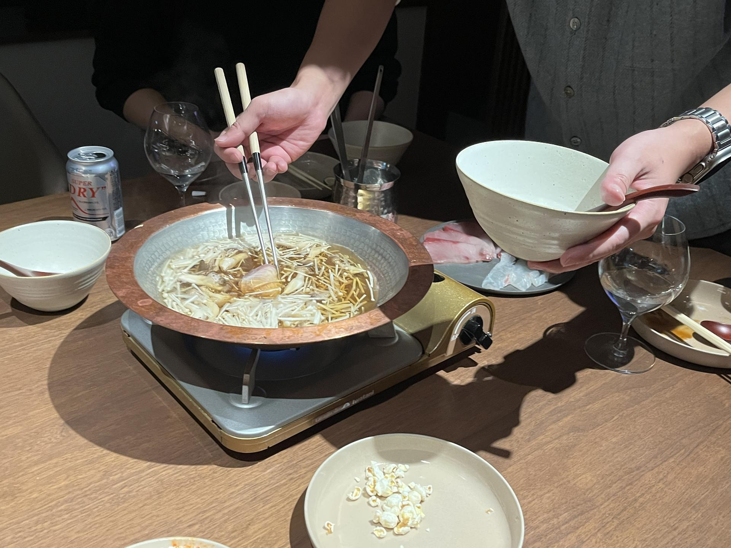 CTO・刀根が目利きしてくれた(!)魚や野菜がたっぷりの熱々の鍋をつつきました。昼から仕込んでいたというお造りの盛り合わせにもみんなで舌鼓。